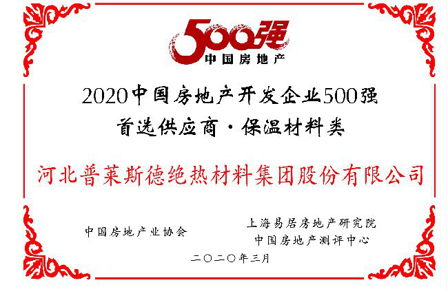 《2020中國房地產開發企業500強測評報告》和《2020中國房地產開發企業500強首選供應商服務商品牌測評報告》同時揭曉。測評報告顯示,河北普萊斯德絕熱材料集團股份有限公司榮獲2020年中國房地產開發企業500強首選供應商服務商品牌測評榜單的保溫材料類10強。